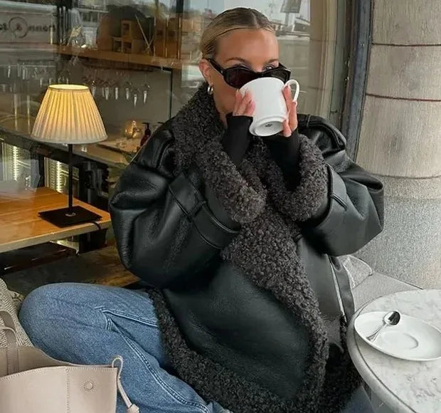 Faux Fur Leather Long Jacket Women Lapel Long Sleeve Belt Thicken Female Coats Winter Fashion Street Patchwork Lady Outwear