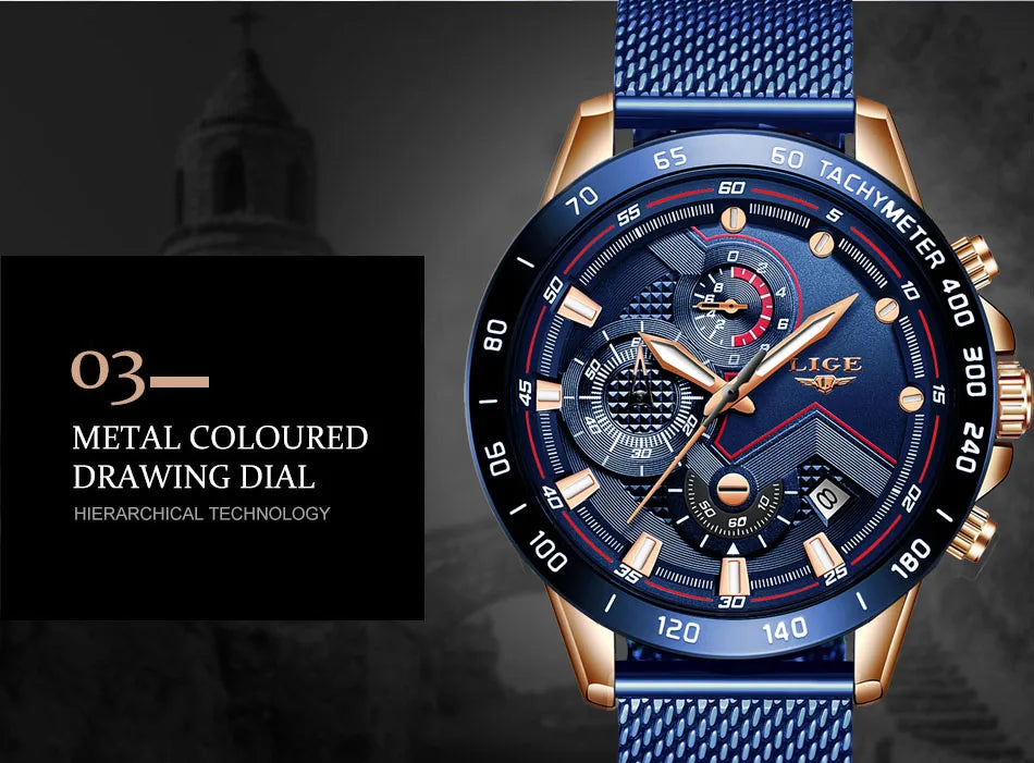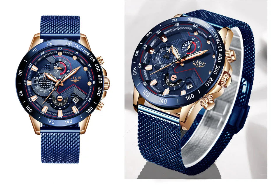 LIGE new watch. Full blue mesh with gold case. This is a stylish business and leisure clock. With chronograph, automatic calendar, waterproof, shockproof, luminous and other functions; suitable for all occasions.