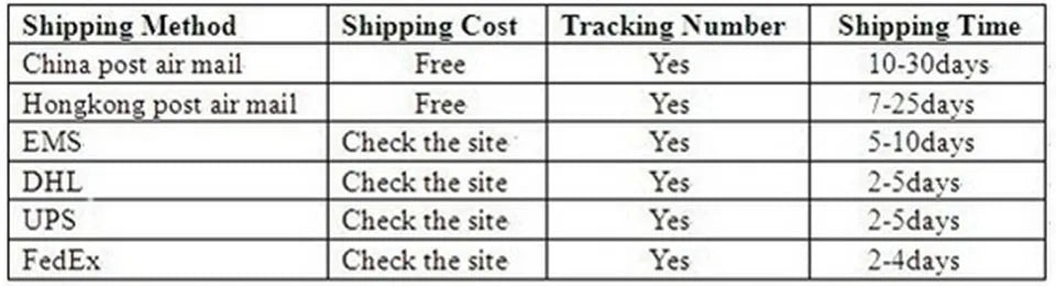 Note:Order less than 200USD will free shipping via china post airmail or hongkong post airmail,Order over 200USD will free shipping via DHL or EMS. But some country need to order more for free shipping EMS and DHL,please contact us.