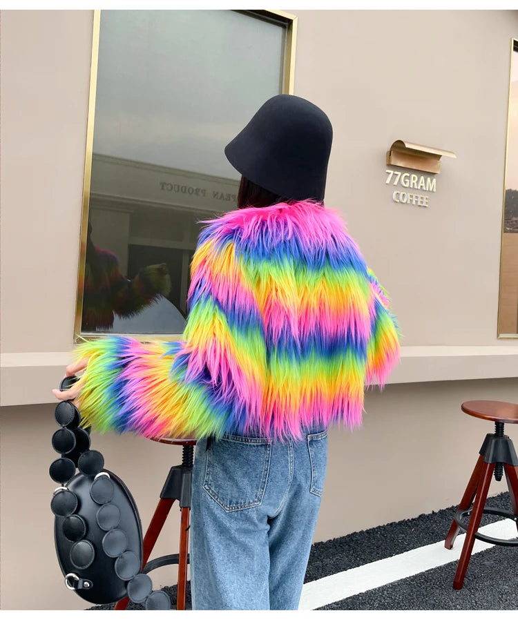 Women's Winter Rainbow Faux Fur Coat Lady Streetwear O Neck Long Sleeve Loose Fuzzy Warm Loose Outwear